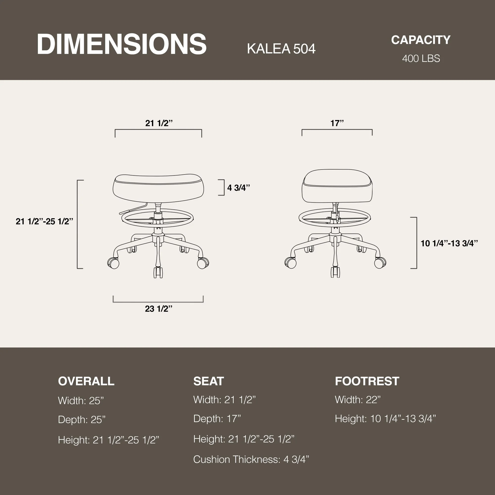 Product Specs : Seat Height: 21.5"–25.5"|Seat Width: 21.5"|Seat Depth: 17"|Foot Ring Height: 10.3"–13.8"|Base Width: 23.5".