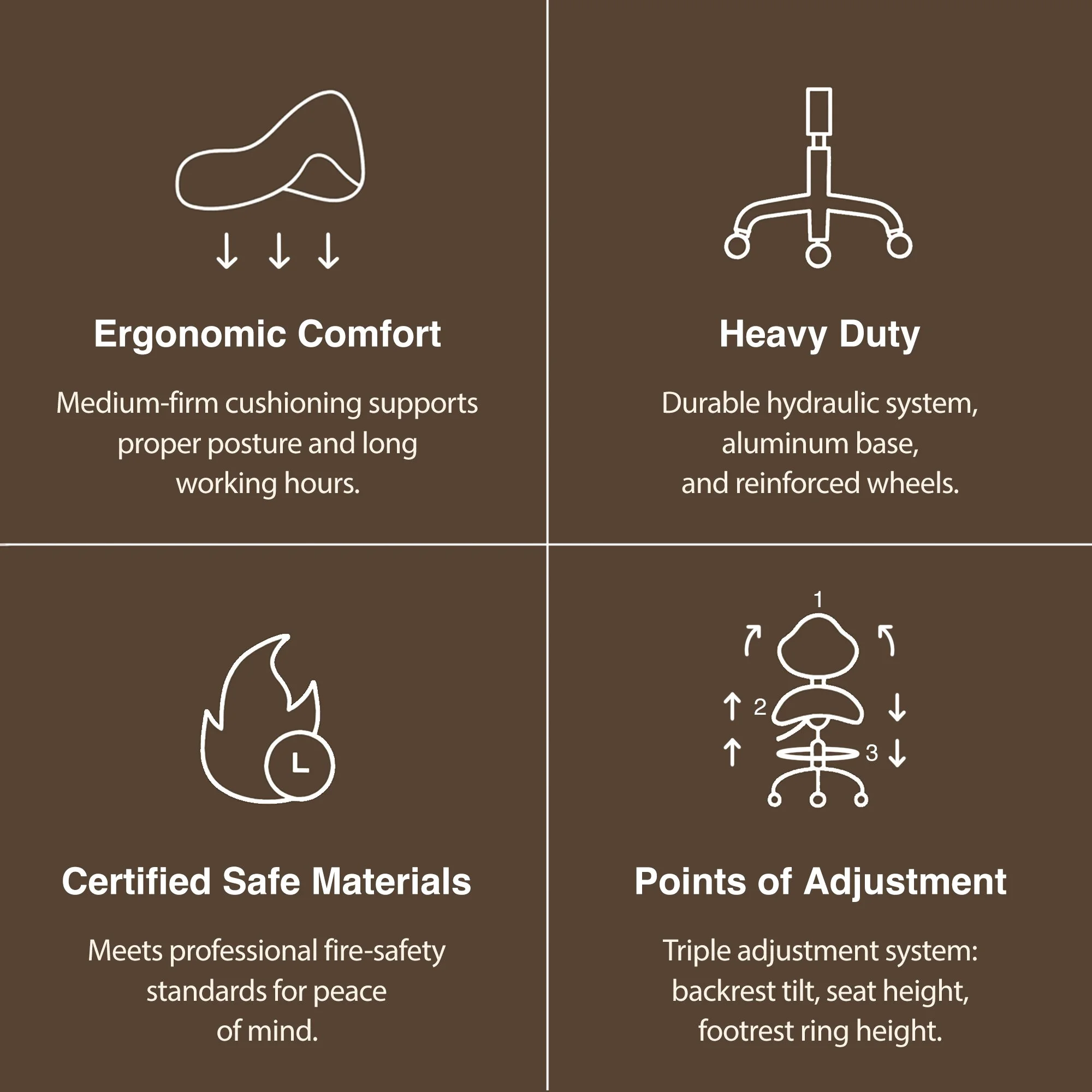 State-of-the-Art Hardware: Fitted with industry-leading gas lift cylinders and a robust aluminum leg base, ensuring both exceptional durability and longevity. High-tech, elastic polyurethane wheels enable smooth and quiet movement across all surfaces.